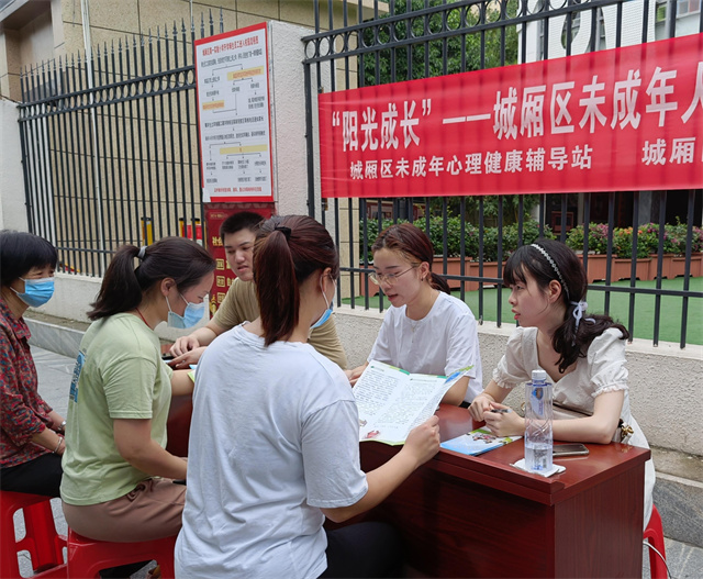我区心理健康咨询服务队的志愿者们在校园周边为万辉社区的居民提供现场心理咨询、资料宣传等活动,普及心理健康知识,提高广大市民对心理健康的重视和对未成年人心理健康的关注度。