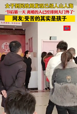 在节后复工第一天,就有网友分享了自己在当地民政局拍下的一幕:离婚室外人山人海,等待办理离婚手续的夫妻,甚至排到了大门口......